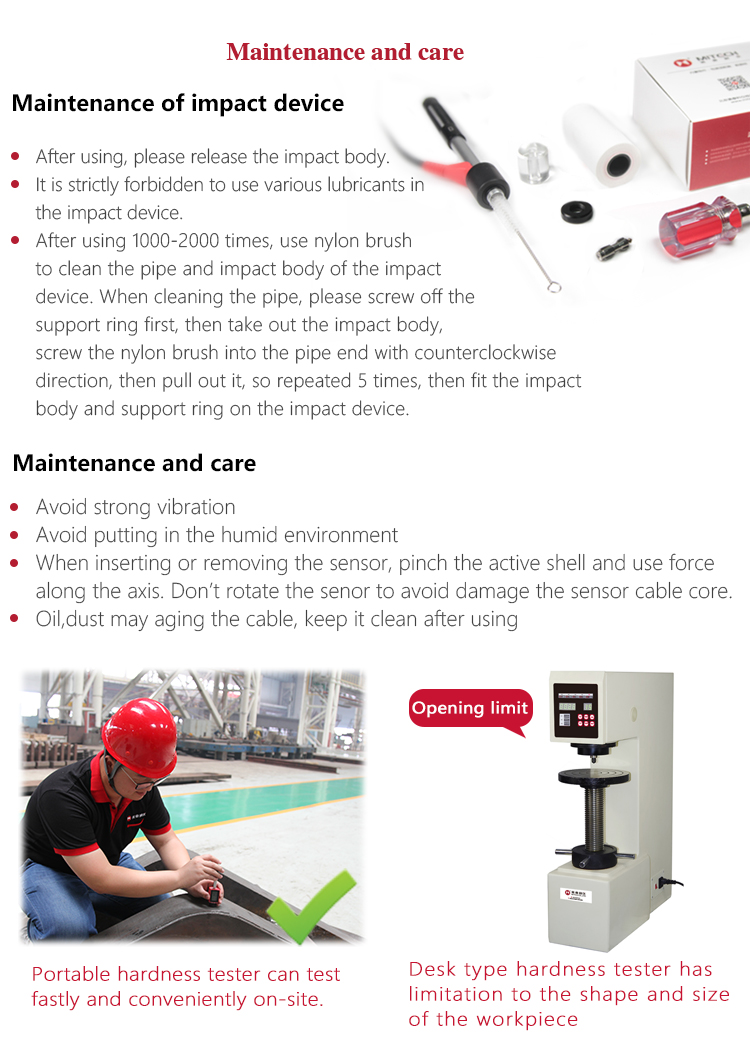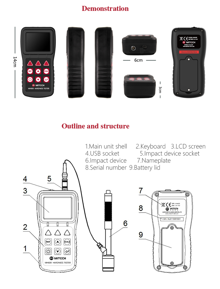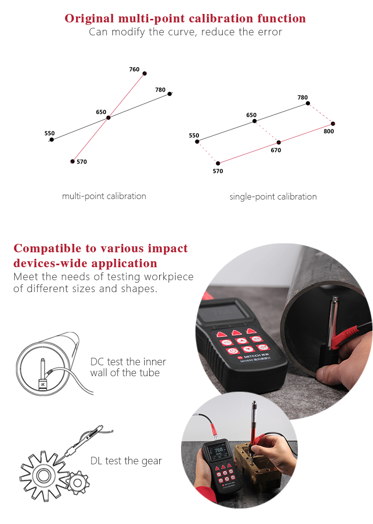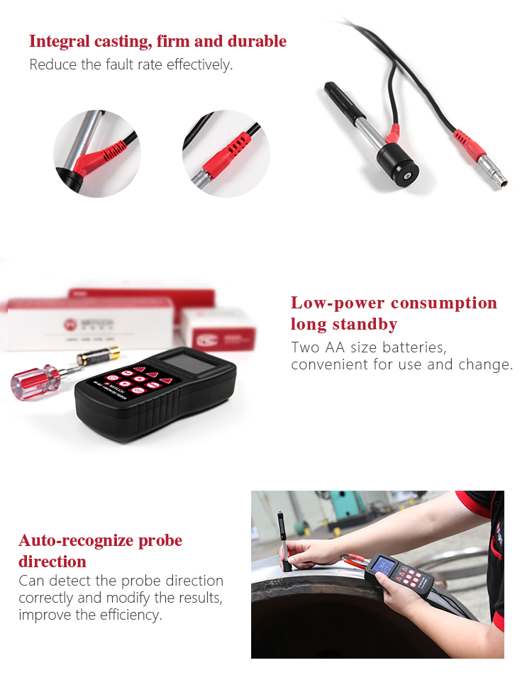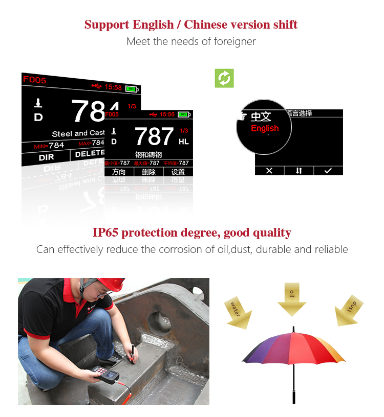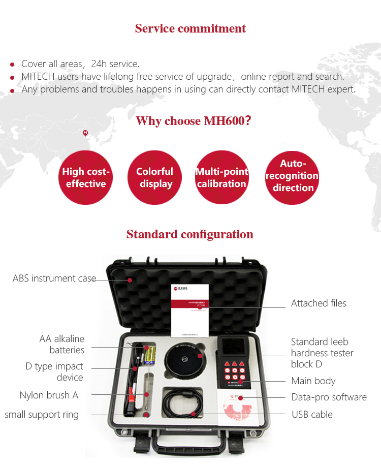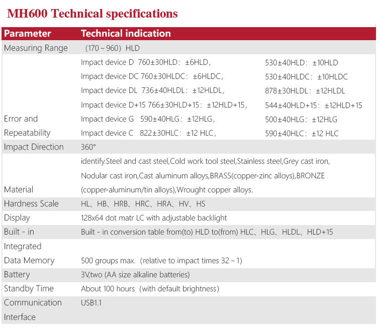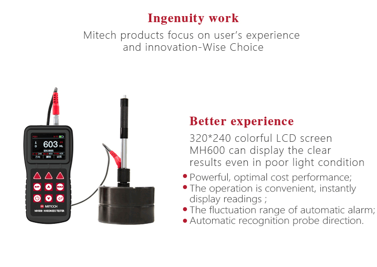 Product OverviewMH600 portable Leeb hardness tester, intelligent design can be quickly and easily for on-site testing of metal hardness. IP65 protection, can effectively prevent oil, dust and other corrosion in harsh field environments; with color LCD display, it can also display clear testing results in dim light and strong sunlight environment , which greatly enhance the visual experience; specil multi- point calibration function for convert curve to reduce errors;it can automatically identify the measuring direction when testing, automatically alarm when out of range, to meet the inspection requirements with high precision and multi-angle material collected and support free Conversion between hardness scale; low power consumption design by two AA batteries, support multiple languages. It is widely used in metal processing and manufacturing, special equipment or permanent component failure analysis in service, inspection and other fields. Particularly suitable for large non-removable part of the site hardness testing. It is necessary professional precision instrument to improve the pass rate of production and cost savings .