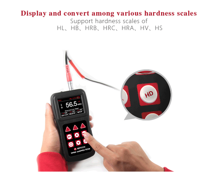 Basic (single-point) calibration and multi-point calibration function for convert curve,to reduce the test error.Hardness scales can be converted to HL,HRB, HRC,HRA, HV,HS,