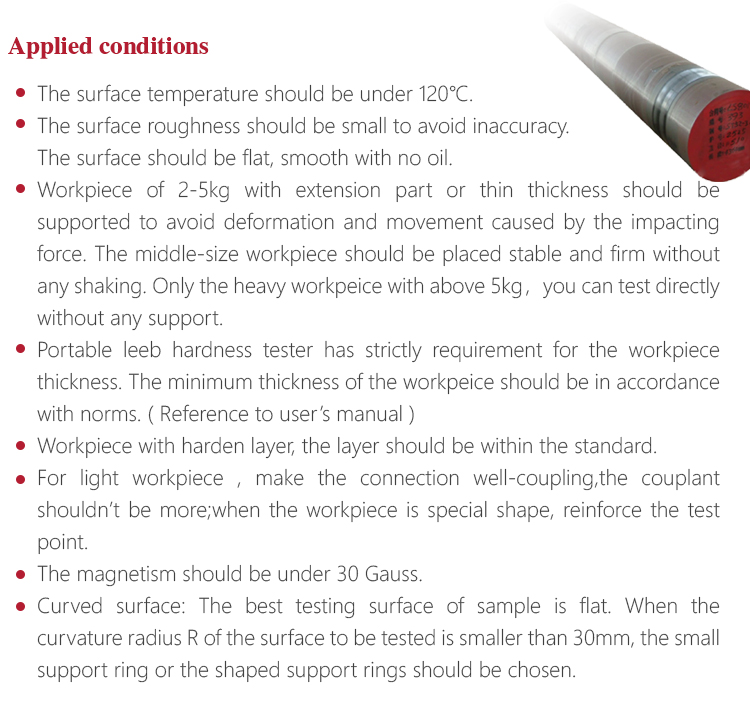 ---- If want accurate conversion from the Leeb hardness value to other hardness value, contrastive test is needed to get conversion relations for the special material. Use inspection qualified Leeb hardness tester and corresponding hardness tester to test at the same sample respectively. For each hardness value, each measure homogeneously 5 points of Leeb hardness value in the surrounding of more than three indentations which need conversion hardness, using Leeb hardness arithmetic average value and corresponding hardness average value as correlative value respectively, make individual hardness contrastive curve. Contrastive curve at least should include three group of correlative data.