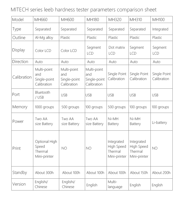 | Mitech portable Leeb hardness testers,with low-power consumption design and long standby, MH180/MH200/MH600/MH660 all adopt two AA size alkaline batteries for power supply. | |