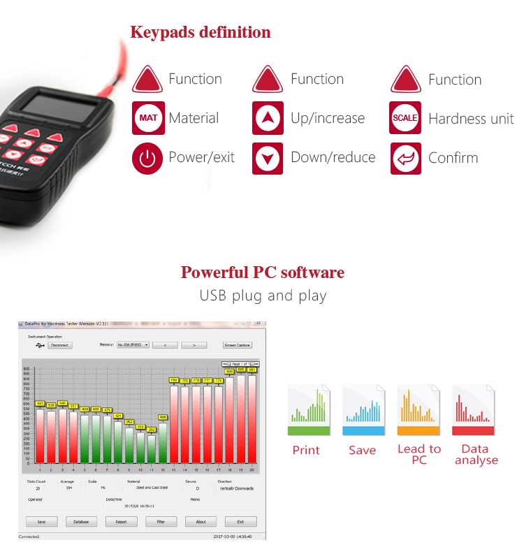USB interface can do transmission measurements, value storage management, value statistical analysis ,printing the value report and batch setting the instrument parameters through the PC data-pro software, to meet the higher demand for quality assurance and management.