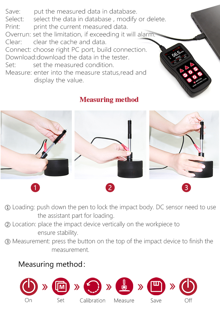 It can store 500 groups (impact times 32 ~ 1) hardness values, each data includes single testing value, average value, measurement date / time, impact direction, frequency, material, hardness and other information.
