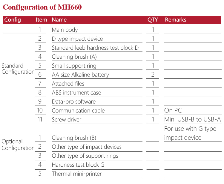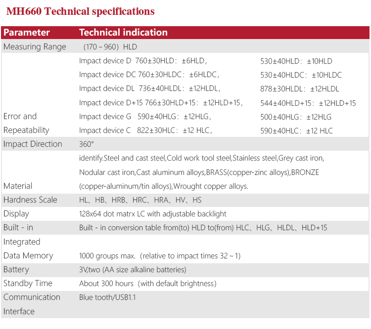 MH660 portable Leeb hardness tester is Mitech latest upgrade model, it focuses on user experience and innovative features. Using 320 × 240 color LCD display, can also present a clear measurement results in dim light and strong sunlight environment , greatly enhance the visual experience; sealed metal case compact design, smaller, better quality, designed to withstand harsh field environment of the oil, dust ,more original point calibration function is used to do multi-point calibration for convert curve to reduce errors;during measurement instrument can automatically identify the measuring direction, automatically alarm when out of range, to meet the inspection requirements with high precision and multi-angle material collected, support free conversion between hardness type; low-power design powered by two AA batteries, support multiple languages.Blue-tooth printer. It is widely used in metal processing and manufacturing, special equipment or permanent component failure analysis in service, inspection and other fields. Particularly suitable for large non-removable part of the site hardness testing. It is to improve the pass rate of production and cost savings necessary professional precision instrument.