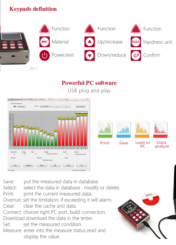 USB interface can do transmission measurements, value storage management, value statistical analysis ,printing the value report and batch setting the instrument parameters through the PC data-pro software, to meet the higher demand for quality sealed aluminum-magnesium alloy metal shell, compact, high portability, reliability, designed for harsh field environments, rugged, unique seal design allows it to resist wet , sand, dust, oil and other contaminants of harsh environments from the ocean to the desert