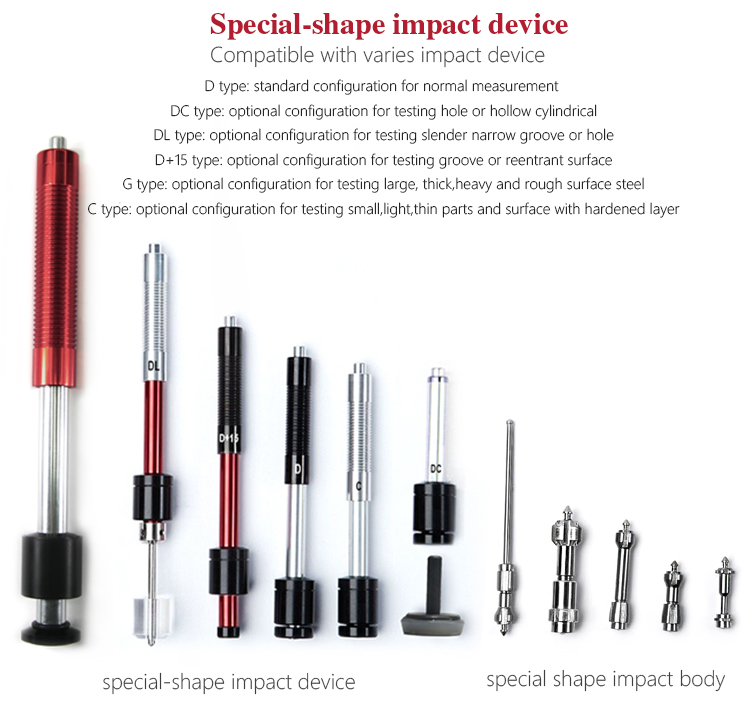 | Portable hardness tester G type impact device, height: 255mm Weight: 250g Diameter: 30mm. Built-in G-type impact device, G-type impact body and G-type ball is larger than the other impact body, the impact force is about 9 times of the D-type ball. the impact is heavier, has low requirement to the surface . Applied to the casting and forging with weight of more than 15kg, the thickness of 10mm or more, more than 1.2mm hardened layer, larger and rougher surface. Main applications:car chassis hardness testing;the installed machinery and permanently assembled parts;rapid testing in large range and multi-measuring areas for large-scale work piece;failure analysis of pressure vessel, steam generator and other equipment;bearings and other parts;material identification in the warehouse of metallic materials;heat treatment workpiece of quality control; It can realize the precise measurements of Leeb, Brinell, Rockwell and others. |