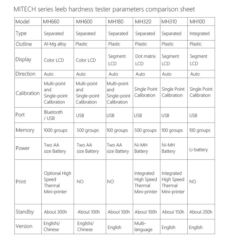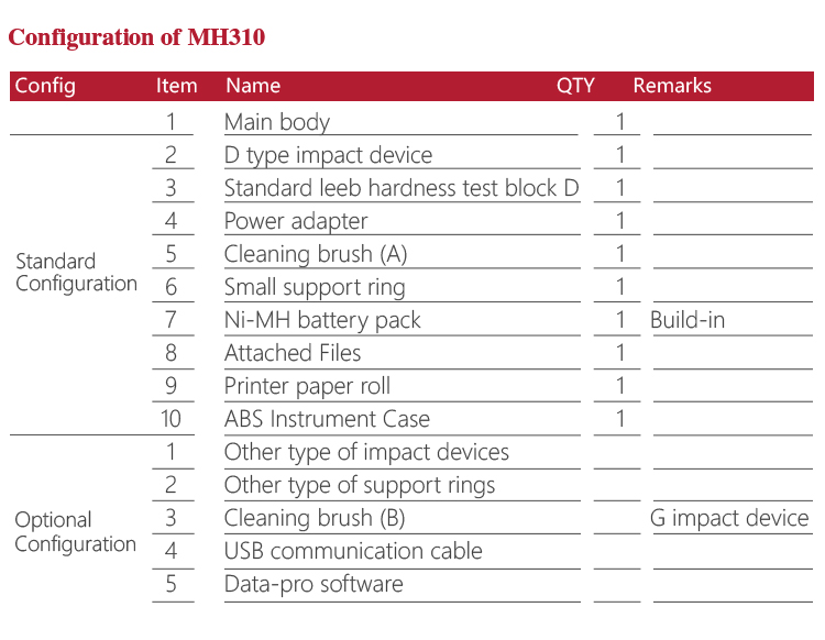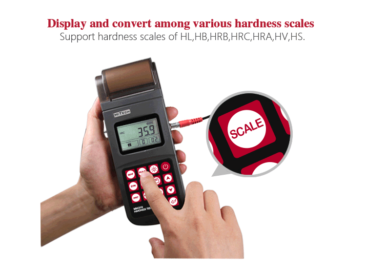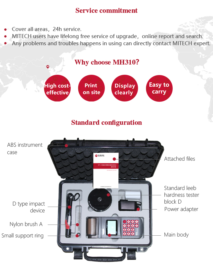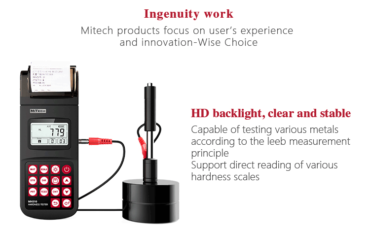 Product OverviewMH310 portable Leeb hardness tester, based on Leeb hardness measuring principle, quick and easy on-site test the hardness of series metal materials, support free conversion between Leeb, Brinell, Rockwell hardness scale and others,It uses high-contrast segment LCD to display clear ,stable performance. integrated high-speed thermal printer ,which can print on-site measurements. It is widely used in annealing, tempering, quenching , quality control for the work piece; hardness testing for machine tool and automobile chassis ; on-site hardness testing of in-service non-removable parts ; quality testing for hardware, forging, machine tools and special steels; quality control for batch production process and so on.Good quality and effective cost ,which is a wise choice for regular need of hardness testing .