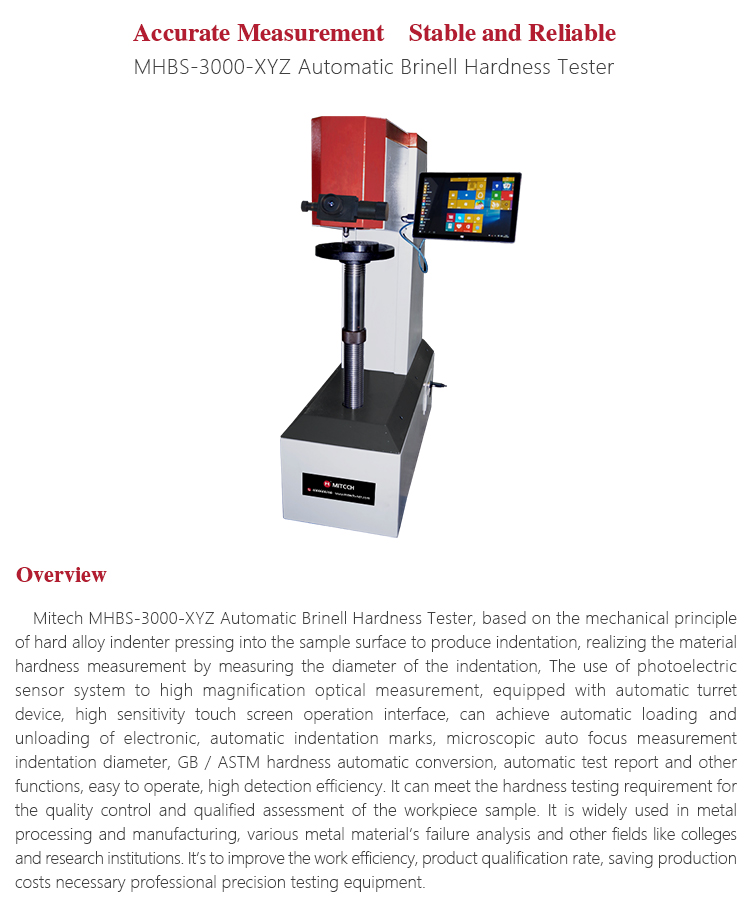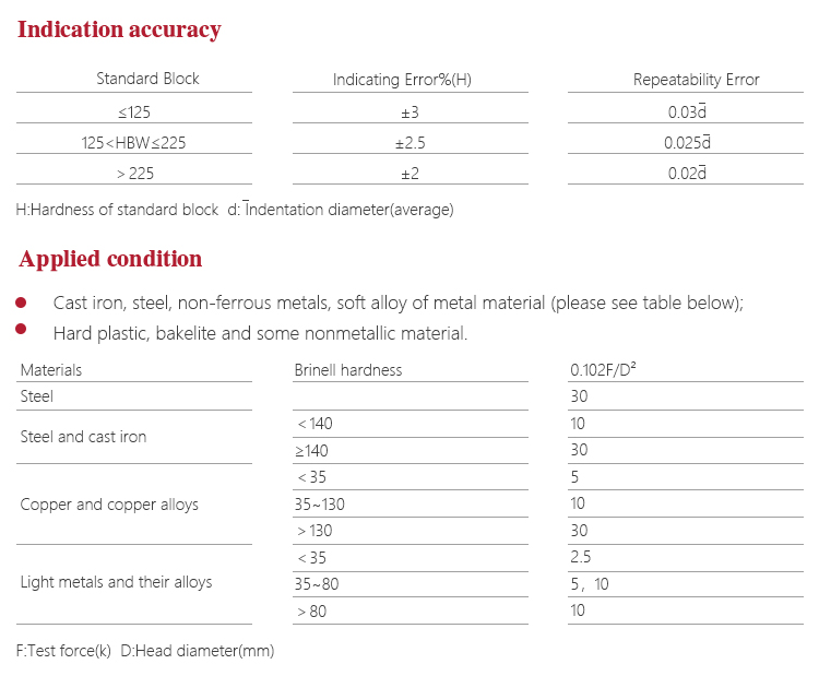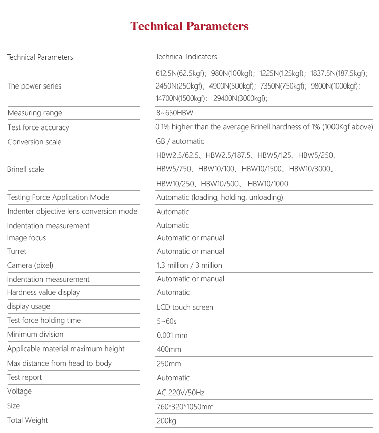 | Brinell scale | HBW2.5/62.5、HBW2.5/187.5、HBW5/125、HBW5/250、 HBW5/750、HBW10/100、HBW10/1500、HBW10/3000、 HBW10/250、HBW1 |