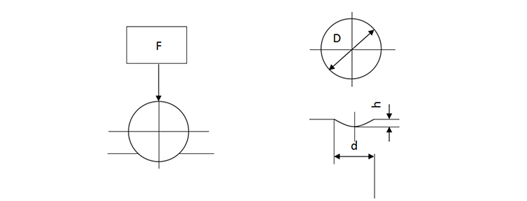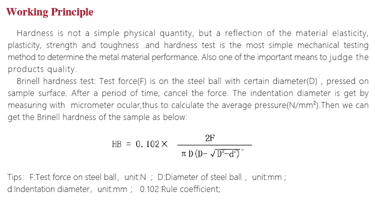 Brinell hardness test: Test force(F) is on the steel ball with certain diameter(D) , pressed on sample surface. After a period of time, cancel the force. The indentation diameter is get by measuring with micrometer ocular,thus to calculate the average pressure(N/mm2).