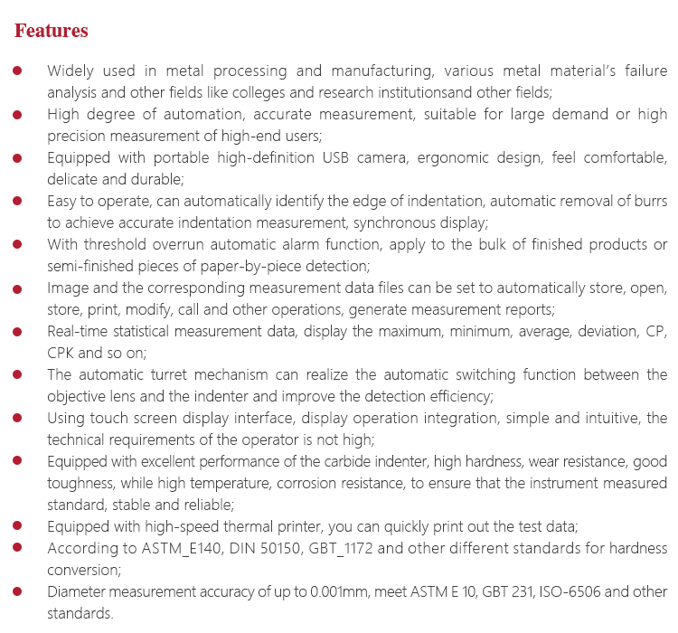 l Diameter measurement accuracy of up to 0.001mm, meet ASTM E 10, GBT 231, ISO-6506 and other standards;