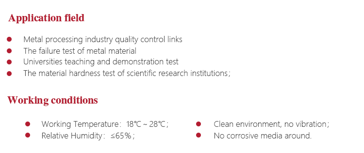Working PrincipleHardness is not a simple physical quantity, but a reflection of the material elasticity, plasticity, strength and toughness .and hardness test is the most simple mechanical testing method to determine the metal material performance. Also one of the important means to judge the products quality.