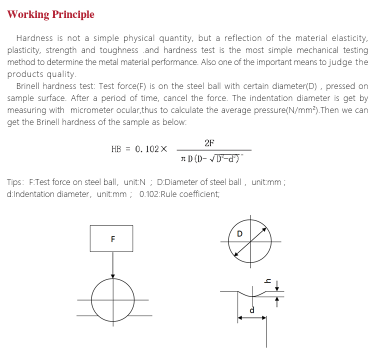 Brinell hardness test: Test force(F) is on the steel ball with certain diameter(D) , pressed on sample surface. After a period of time, cancel the force. The indentation diameter is get by measuring with micrometer ocular,thus to calculate the average pressure(N/mm2).