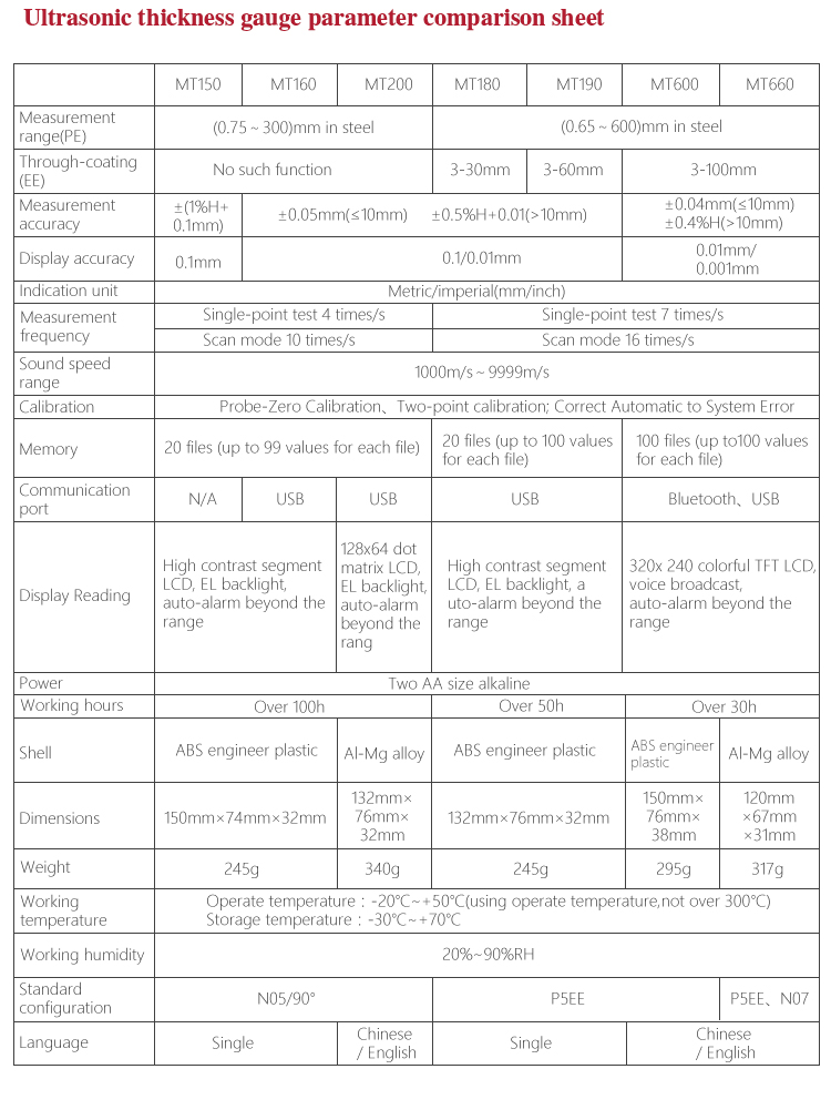 The model MT160 is a digital ultrasonic thickness gauge .Based on the principle of ultrasonic principle, the instrument is capable of measuring the thickness of various materials, such as metal, plastic, ceramic, glass and many other good ultrasonic conductors. It of all kinds of materials. Compared with the traditional measurement methods, the advantages of ultrasonic thickness gauge is exposed to one side of the workpiece to complete the measurement. Its unique non-destructive testing performance provide the perfect solution for the thickness testing of closed pipes, containers, etc. It is widely used in pertroleum , chemical ,metallurgy, shipbuilding, aviation, aerospace and other fields because of monitoring corrosion thinning degree of various pipes and pressure vessels. It can also be used for precise measurement of sheet metal and machined parts.