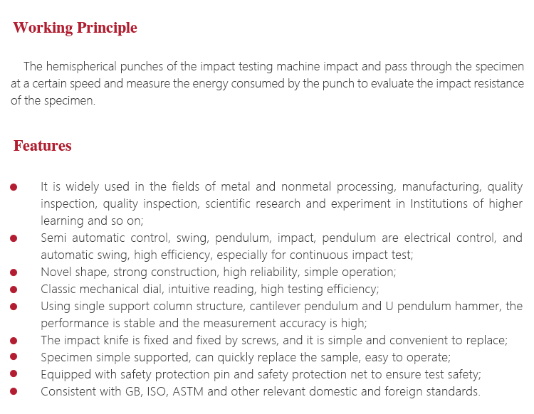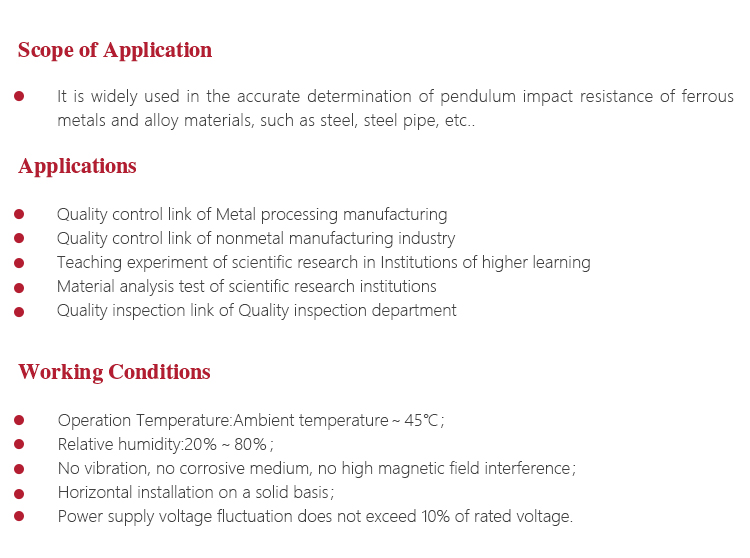 Function & applicationIt is widely used in the accurate determination of pendulum impact resistance of ferrous metals and alloy materials, such as steel, steel pipe, etc..