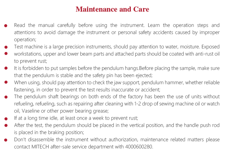 l After the test, the pendulum should be placed in the vertical position, and the handle push rod is placed in the braking