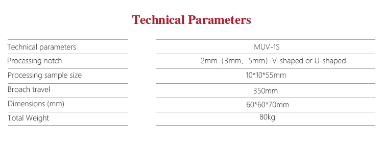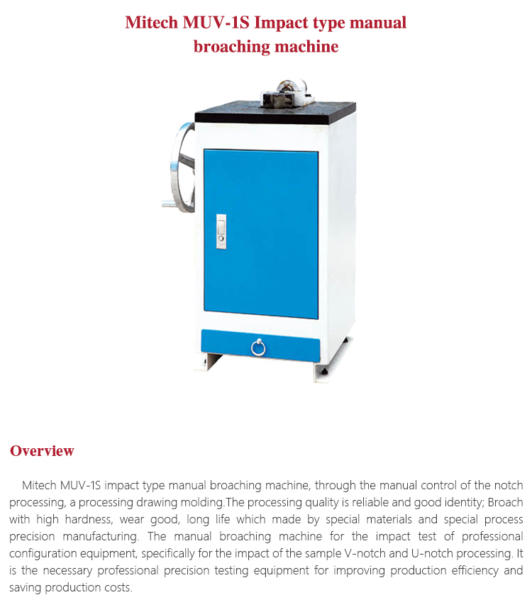 Mitech MUV-1S impact type manual broaching machine, through the manual control of the notch processing, a processing drawing molding.The processing quality is reliable and good identity; Broach with high hardness, wear good, long life which made by special materials and special process precision manufacturing. The manual broaching machine for the impact test of professional configuration equipment, specifically for the impact of the sample V-notch and U-notch processing. It is the necessary professional precision testing equipment for improving production efficiency and saving production costs.