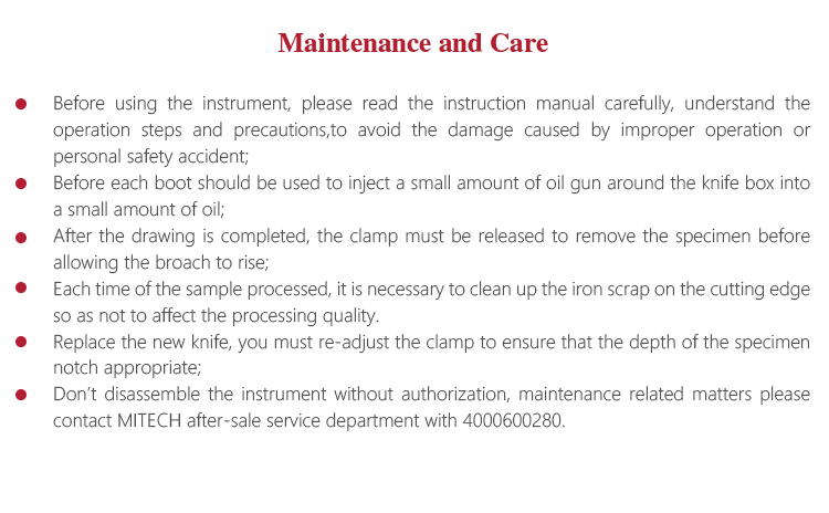 l Each time of the sample processed, it is necessary to clean up the iron scrap on the cutting edge so as not to affect the
