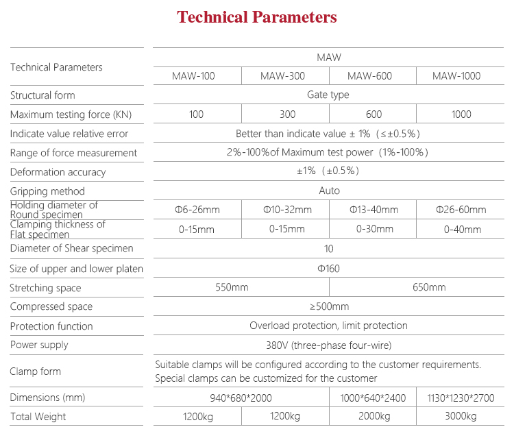 Product OverviewMitech MAW micro control series hydraulic universal testing machine , can conduct mechanical properties tests for metallic, non-metallic and composite materials including stretching, compression, bending, cutting, stripping, tearing and so on ,through controlling the high-pressure pump to drive the screw movement and equipped with the corresponding auxiliary. It uses manual and electro-hydraulic servo dual control mode, high-precision gap sealed cylinder, digital processing, closed-loop control technology, which has stable property, powerful function, accurate data processing, solid and simple structure, high reliability, simple performance, friendly interface. This product can be widely used in areas such as metallic and non-metallic processing industry, quality testing in quality inspection departments, scientific research in higher education institutions , which is a necessary professional precision testing equipment to improve production efficiency and save production costs