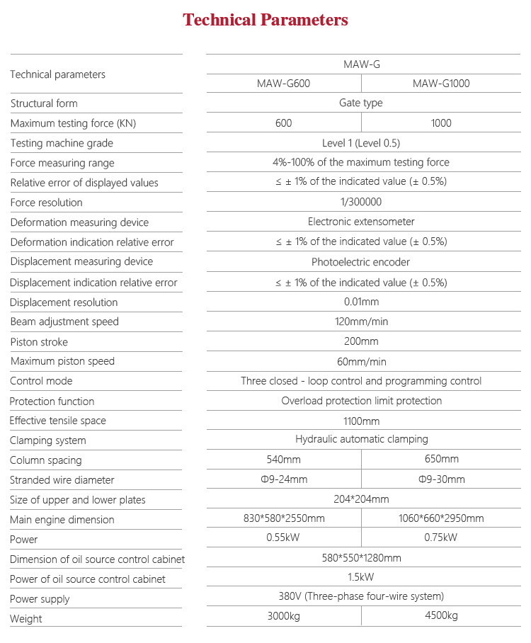 Product OverviewMitech MAW-G micro control series of steel wire tensile testing machine, through the control of high-pressure pump to drive the screw movement, mainly for the prestressed steel strand tensile strength test and analysis. With manual and electro-hydraulic servo dual control mode, high precision gap sealing cylinder, digital processing, closed-loop control technology, it have stable performance, powerful, accurate data processing, strong structure, simple structure, high reliability, simple operation. It’s widely used in metal and non-metallic processing industry, quality inspection departments, scientific research and other areas of higher education institutions and it’s a necessary professional precision testing equipment for improve production efficiency and save production costs.