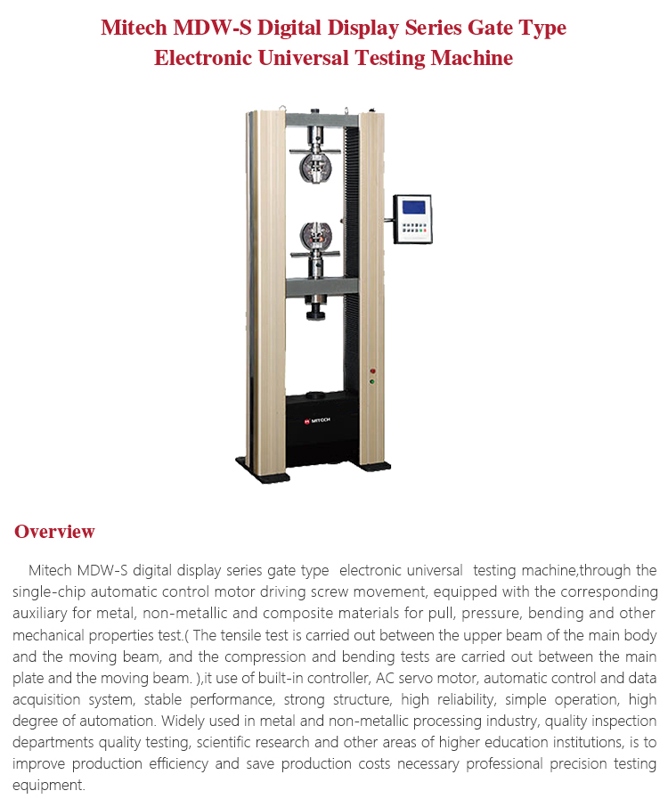 Product OverviewMitech MDW-S digital display series gate type electronic universal testing machine,through the single-chip automatic control motor driving screw movement, equipped with the corresponding auxiliary for metal, non-metallic and composite materials for pull, pressure, bending and other mechanical properties test.( The tensile test is carried out between the upper beam of the main body and the moving beam, and the compression and bending tests are carried out between the main plate and the moving beam. ),it use of built-in controller, AC servo motor, automatic control and data acquisition system, stable performance, strong structure, high reliability, simple operation, high degree of automation. Widely used in metal and non-metallic processing industry, quality inspection departments quality testing, scientific research and other areas of higher education institutions, is to improve production efficiency and save production costs necessary professional precision testing equipment.