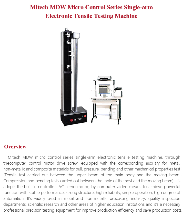 Mitech MDW micro control series single-arm electronic tensile testing machine, through the computer control motor drive screw, equipped with the corresponding auxiliary for metal, non-metallic and composite materials for pull, pressure, bending and other mechanical properties test (Tensile test carried out between the upper beam of the main body and the moving beam. Compression and bending tests carried out between the table of the host and the moving beam). It’s adopts the built-in controller, AC servo motor, by computer-aided means to achieve powerful function with stable performance, strong structure, high reliability, simple operation, high degree of automation. It’s widely used in metal and non-metallic processing industry, quality inspection departments, scientific research and other areas of higher education institutions and it’s a necessary professional precision testing equipment for improve production efficiency and save production costs.