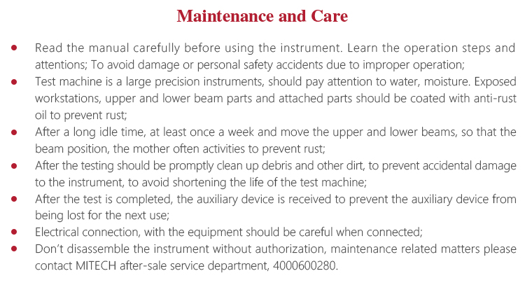 l Test machine is a large precision instruments, should pay attention to water, moisture. Exposed workstations, upper and lower beam parts and attached parts should be coated with anti-rust oil to prevent rust;