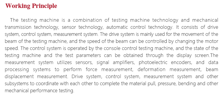 The testing machine is a combination of testing machine technology and mechanical transmission technology, sensor technology, automatic control technology. It consists of drive system, control system, measurement system. The drive system is mainly used for the movement of the beam of the testing machine, and the speed of the beam can be controlled by changing the motor speed. The control system is operated by the console control testing machine, and the state of the testing machine and the test parameters can be obtained through the display screen.The measurement system utilizes sensors, signal amplifiers, photoelectric encoders, and data processing systems to perform force measurement, deformation measurement, beam displacement measurement. Drive system, control system, measurement system and other subsystems to coordinate with each other to complete the material pull, pressure, bending and other mechanical performance testing.