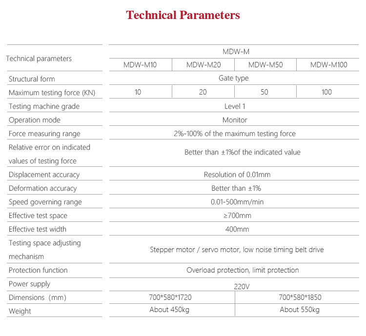 Product OverviewMitech MDW-M series of micro control wood-based universal testing machine, through the single-chip automatic control motor driving screw movement, can do various of physical and chemical properties of the test for wood-based panels and decorative panels. With built-in controller, AC servo motor, automatic control and data acquisition system, stable performance, strong structure, high reliability, simple operation, high degree of automation, it widely used in the wood-based panels and decorative panels of the internal bond strength, surface bonding strength, tensile strength test, bending test, elastic modulus test, grip force test and plywood shear cut test. It is a necessary professional precision testing equipment for improve production efficiency and save production costs.