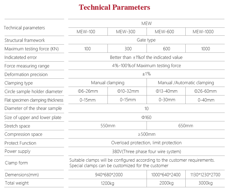 Product OverviewMitech MEW Micro Control Series Hydraulic Universal Testing Machine through controling high pressure oil pump to drive screw motion, equipped with corresponding auxiliary equipment for metal, nonmetal and composite materials tensile, compression, bending, shear, peel, tear and other mechanical properties test, its clearance seal oil cylinder with high precision, computer display technology, digital processing, high precision data acquisition control technology, its performance is stable, powerful functions, the data processing accurate, is solid in construction, simple structure, high reliability, simple operation, friendly interface. Widely used in metal and non-metallic processing and manufacturing, quality inspection department quality inspection, institutions of higher learning, scientific research test, and other fields, it is to improve the production efficiency, save production costs necessary professional precision testing instrument.