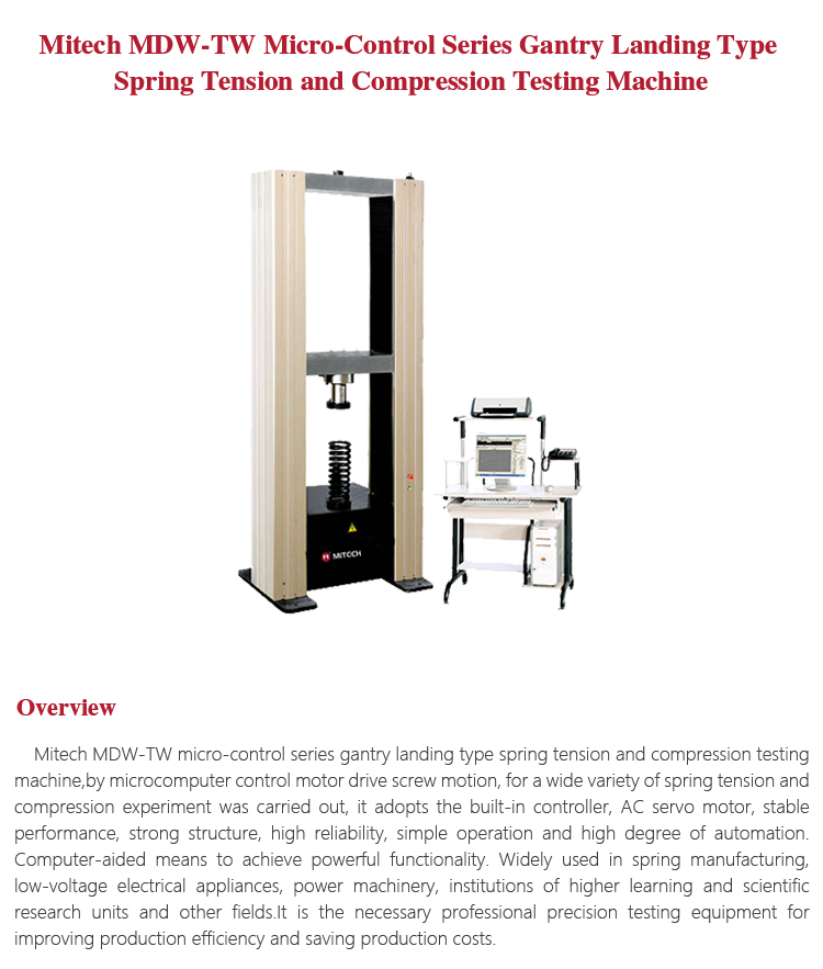 Mitech MDW-TW micro-control series gantry landing type spring tension and compression testing machine,by microcomputer control motor drive screw motion, for a wide variety of spring tension and compression experiment was carried out, it adopts the built-in controller, AC servo motor, stable performance, strong structure, high reliability, simple operation and high degree of automation. Computer-aided means to achieve powerful functionality. Widely used in spring manufacturing, low-voltage electrical appliances, power machinery, institutions of higher learning and scientific research units and other fields.It is the necessary professional precision testing equipment for improving production efficiency and saving production costs.