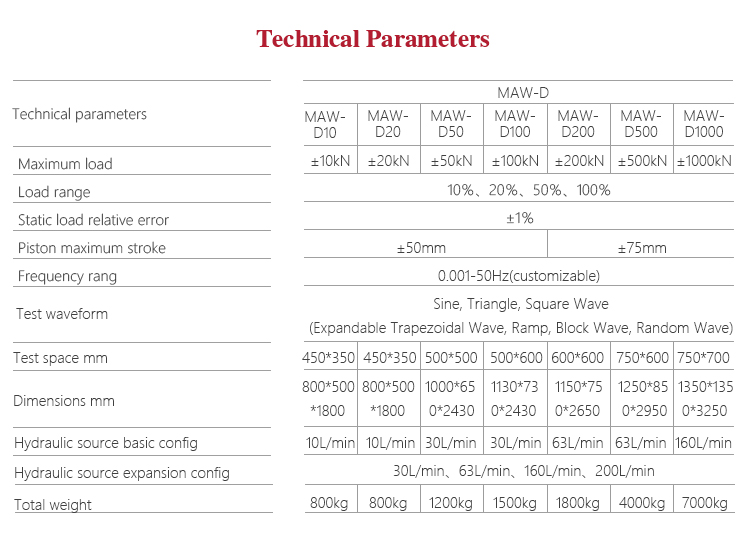Product OverviewMITECH MAW-D Micro Control Series Static and Dynamic Universal Testing Machine, driven by computer-controlled high-pressure pump driven screw movement, equipped with the corresponding aids for metal, non-metallic and composite materials for dynamic fatigue test and static mechanical properties test, which uses microcomputer control mode High-precision gap seal cylinder, digital processing, closed-loop control technology, its performance is stable, powerful, data processing accuracy, robust construction, simple structure, high reliability, simple operation and friendly interface. Widely used in metal and non-metallic manufacturing industry, quality inspection department of quality testing, scientific research and other fields of higher education and other fields,it is to improve production efficiency, cost-saving production of essential professional precision testing equipment.