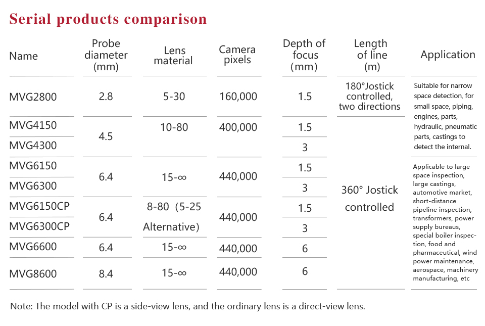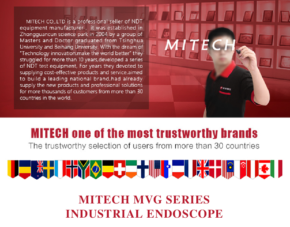 MITECH MVG series of industrial endoscope, based on the CMOS image sensor principle, can realize image shooting in the pipe or narrow area which can not be directly observed. And the results can be displayed in high-definition ,so as to achieve non-destructive testing. MITECH MVG series endoscope is a high-precision video electronics industry endoscope, the use of color LCD display and highly integrated CMOS image sensor to ensure that the video endoscopic image of the clear, realistic; its low power consumption, quick signal transmission speed ,easy to carry and operate,different diameter testing lines can be replaced to achieve multi-purpose use and cost saving. It can detect pipe or narrow spaces without tearing apart or damaging machine while not working.Cracks, welds, foreign body, wear and internal processing of parts and other circumstances can be detected with high quality images. It is widely used in aerospace, petrochemical, mechanical casting, national defense military, power production, automobile transportation and other fields, and is the important detection and monitoring equipment of industrial equipment testing and maintenance and other aspects.