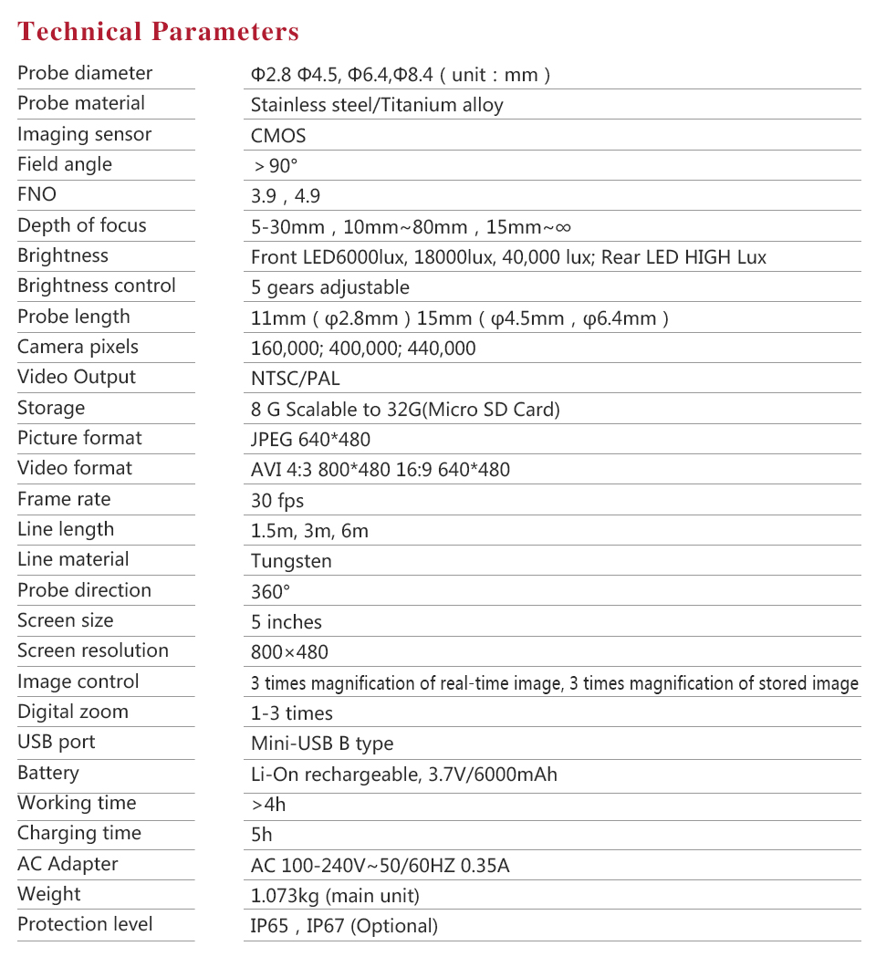 l The front part of the probe has 6 ultra-high brightness white LED lights, and the illumination is adjustable in 5 steps. The rear-end high-brightness LED auxiliary illumination;