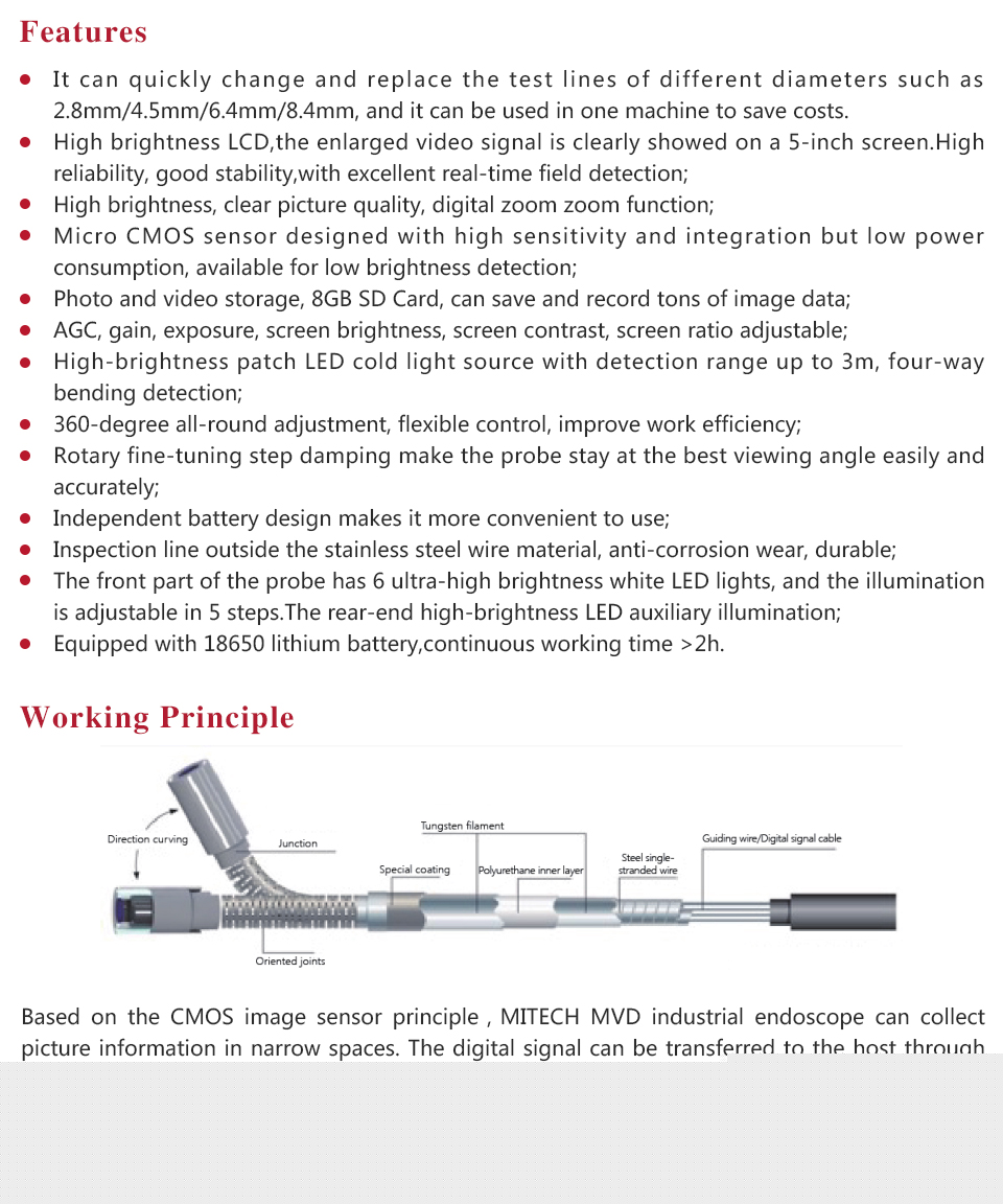 Based on the CMOS image sensor principle,MITECH MVJ industrial endoscope can collect picture information in narrow spaces. The digital signal can be transferred to the host through video signal cable plugged in pipe, thus to achieve picture display and storage.The oriented joints connect the probe with insert tube and the guide wire inside the joints can turn around freely in all directions controlled by mechanical device. As a result, the CMOS sensor can shoot excellent photos as required in time.