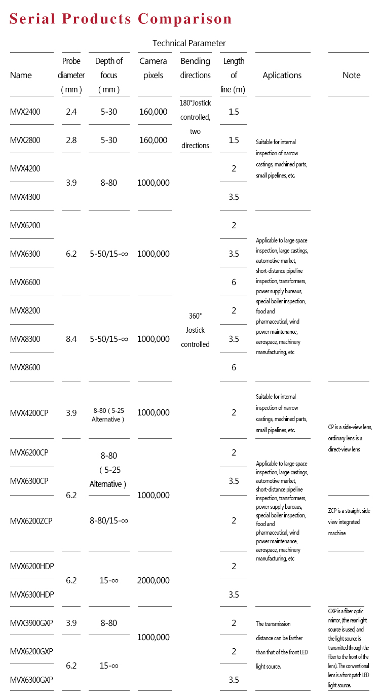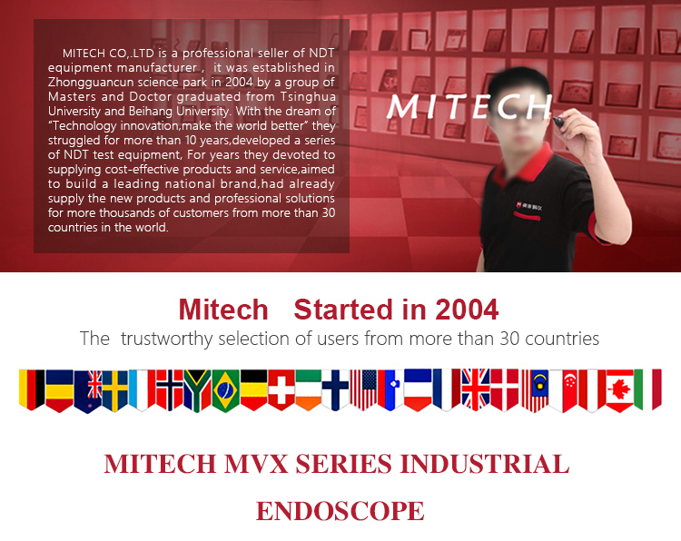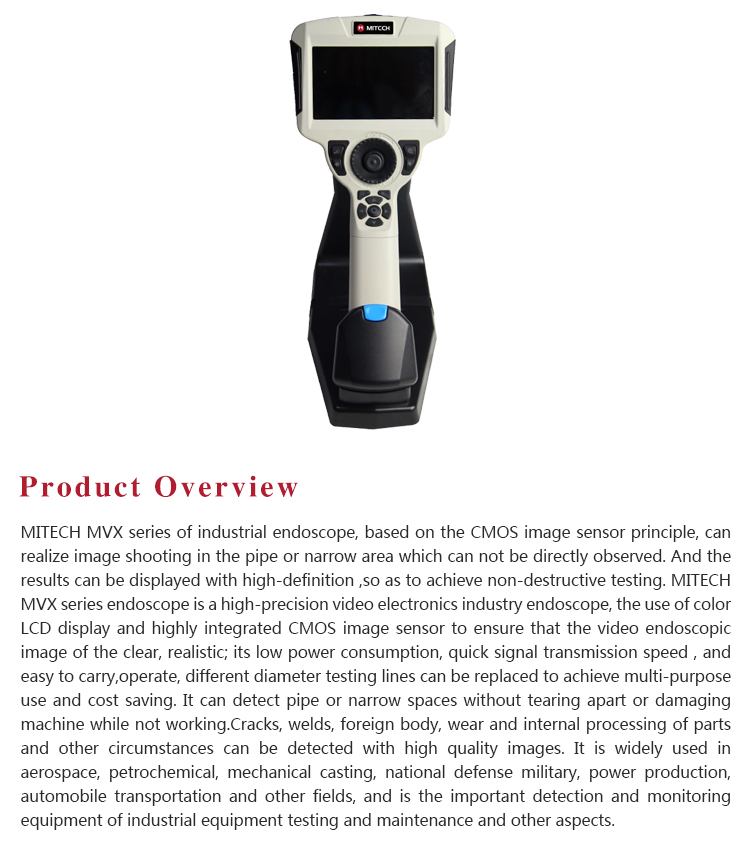 Product OverviewMITECH MVX series of industrial endoscope, based on the CMOS image sensor principle, can realize image shooting in the pipe or narrow area which can not be directly observed. And the results can be displayed with high-definition ,so as to achieve non-destructive testing. MITECH MVX series endoscope is a high-precision video electronics industry endoscope, the use of color LCD display and highly integrated CMOS image sensor to ensure that the video endoscopic image of the clear, realistic; its low power consumption, quick signal transmission speed , and easy to carry,operate, different diameter testing lines can be replaced to achieve multi-purpose use and cost saving. It can detect pipe or narrow spaces without tearing apart or damaging machine while not working.Cracks, welds, foreign body, wear and internal processing of parts and other circumstances can be detected with high quality images. It is widely used in aerospace, petrochemical, mechanical casting, national defense military, power production, automobile transportation and other fields, and is the important detection and monitoring equipment of industrial equipment testing and maintenance and other aspects.