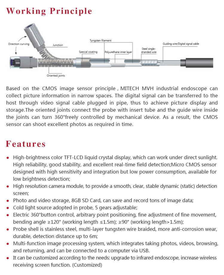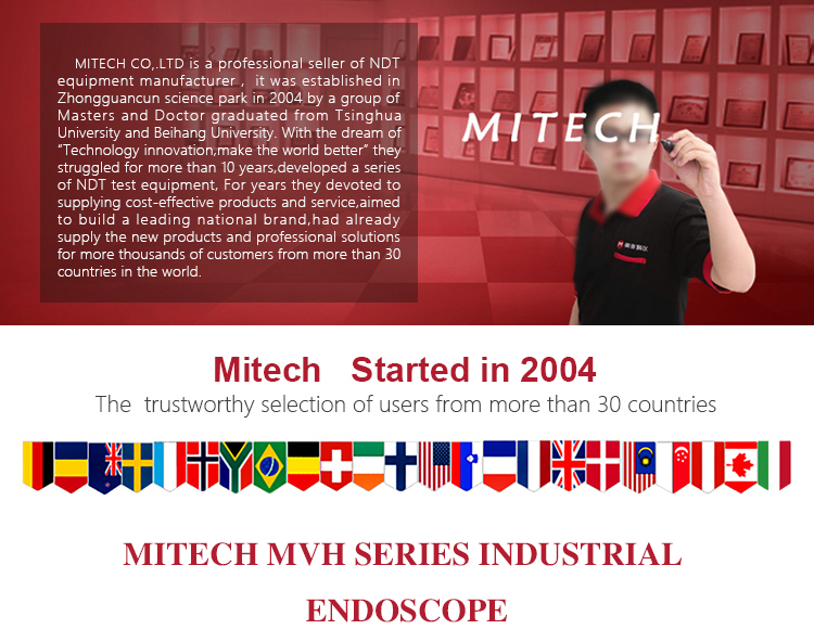 MITECH MVH Electric 360°series of industrial endoscope, based on the CMOS image sensor principle, can realize image shooting in the pipe or narrow area which can not be directly observed. And the results can be displayed with high-definition ,so as to achieve non-destructive testing. MITECH MVH series endoscope is a high-precision video electronics industry endoscope, the use of color LCD display and highly integrated CMOS image sensor to ensure that the video endoscopic image of the clear, realistic; its low power consumption, quick signal transmission speed , and easy to carry,operate. It can detect pipe or narrow spaces without tearing apart or damaging machine while not working.Cracks, welds, foreign body, wear and internal processing of parts and other circumstances can be detected with high quality images. It is widely used in aerospace, petrochemical, mechanical casting, national defense military, power production, automobile transportation and other fields, and is the important detection and monitoring equipment of industrial equipment testing and maintenance and other aspects.
