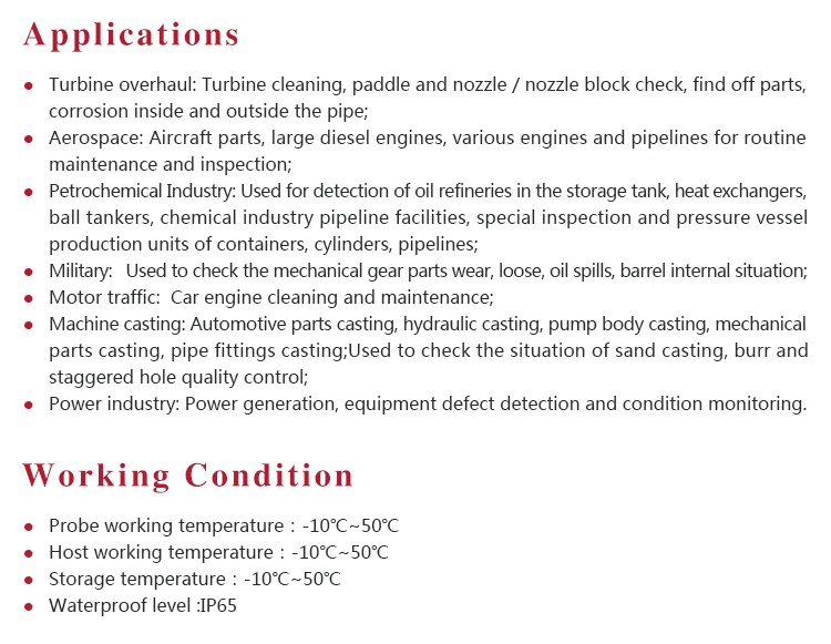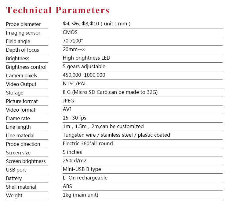 l After use, do not soak the product, the soft cloth can be used to clean the probe and mirror host, and then into the ABS case, so as not to cause corrosion or damage to the instrument;