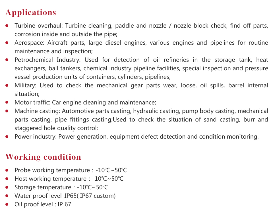 Product OverviewMITECH MVE Electric four directions series of industrial endoscope, based on the CMOS image sensor principle, can realize image shooting in the pipe or narrow area which can not be directly observed. And the results can be displayed with high-definition ,so as to achieve non-destructive testing. MITECH MVE series endoscope is a high-precision video electronics industry endoscope, the use of color LCD display and highly integrated CMOS image sensor to ensure that the video endoscopic image of the clear, realistic; its low power consumption, quick signal transmission speed , and easy to carry,operate. It can detect pipe or narrow spaces without tearing apart or damaging machine while not working.Cracks, welds, foreign body, wear and internal processing of parts and other circumstances can be detected with high quality images. It is widely used in aerospace, petrochemical, mechanical casting, national defense military, power production, automobile transportation and other fields, and is the important detection and monitoring equipment of industrial equipment testing and maintenance and other aspects.