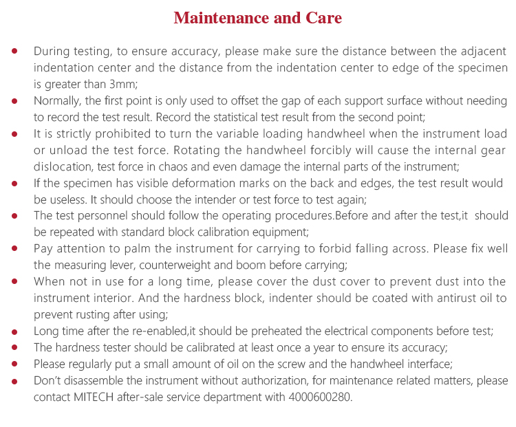 Instrument Maintenancel During testing, to ensure accuracy, please make sure the distance between the adjacent indentation center and the