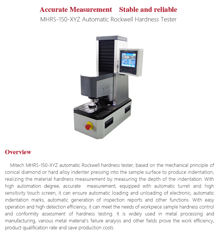 Mitech MHRS-150-XYZ automatic Rockwell hardness tester, based on the mechanical principle of conical diamond or hard alloy indenter pressing into the sample surface to produce indentation, realizing the material hardness measurement by measuring the depth of the indentation. With high automation degree, accurate  measurement, equipped with automatic turret and high sensitivity touch screen, it can ensure automatic loading and unloading of electronic, automatic indentation marks, automatic generation of inspection reports and other functions. With easy operation and high detection efficiency, it can meet the needs of workpiece sample hardness control and conformity assessment of hardness testing. It is widely used in metal processing and manufacturing, various metal material’s failure analysis and other fields like colleges and research institutions. it is the professional precision testing equipment to improve the work efficiency, product qualification rate and save production costs.