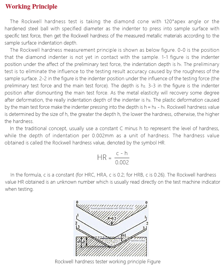 The Rockwell hardness test is taking the diamond cone with 120°apex angle or the hardened steel ball with specified diameter as the indenter to press into sample surface with specific test force, then get the Rockwell hardness of the measured metallic materials according to the sample surface indentation depth.