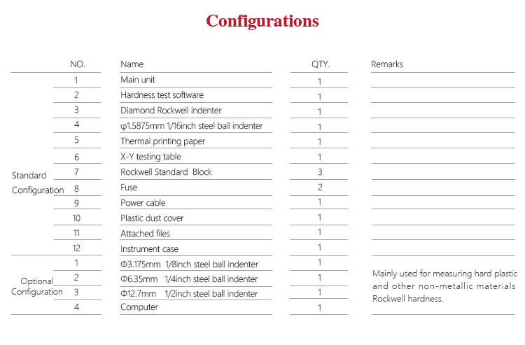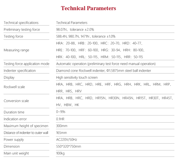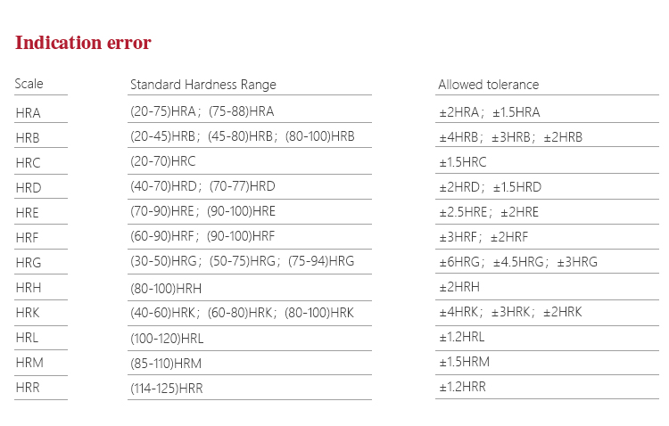 Measuring range HRA:20-88、HRB:20-100、HRC:20-70、HRD:40-77、 HRE:70-100、HRF:60-100、HRG:30-94、HRH:80-100、 HRK:40-100、HRL