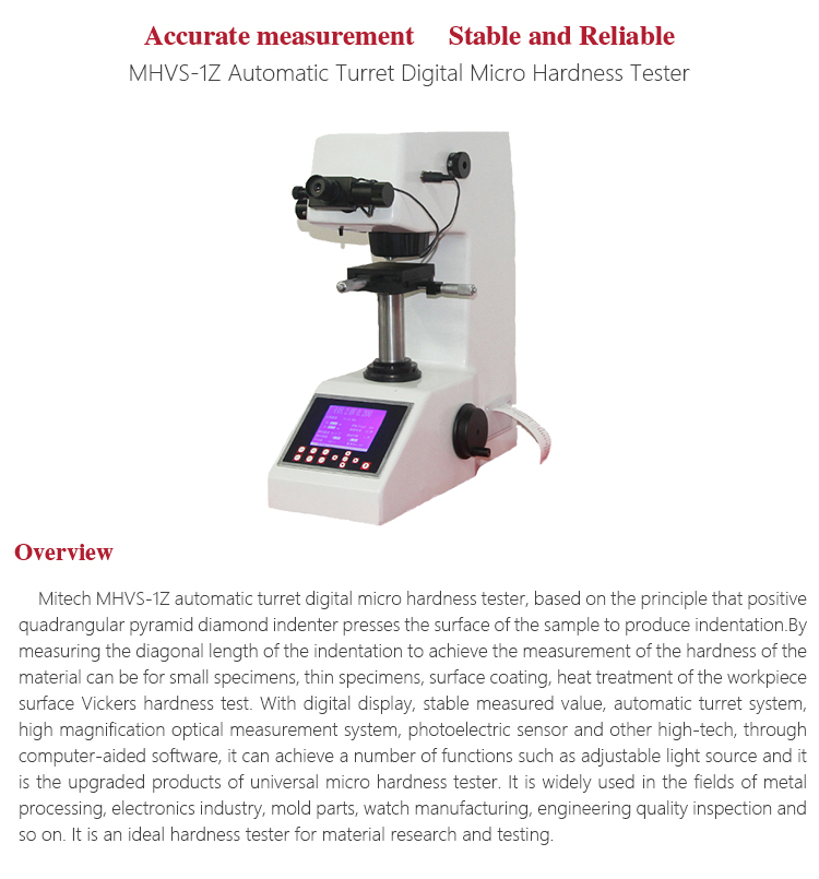 Product OverviewMitech MHVS-1Z automatic turret digital micro hardness tester, based on the principle that positive quadrangular pyramid diamond indenter presses the surface of the sample to produce indentation.By measuring the diagonal length of the indentation to achieve the measurement of the hardness of the material can be for small specimens, thin specimens, surface coating, heat treatment of the workpiece surface Vickers hardness test. With digital display, stable measured value, automatic turret system, high magnification optical measurement system, photoelectric sensor and other high-tech, through computer-aided software, it can achieve a number of functions such as adjustable light source and it is the upgraded products of universal micro hardness tester. It is widely used in the fields of metal processing, electronics industry, mold parts, watch manufacturing, engineering quality inspection and so on. It is an ideal hardness tester for material research and testing.