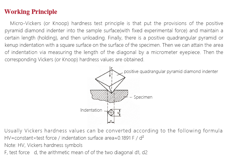 Working PrincipleMicro-Vickers (or Knoop) hardness test principle is that put the provisions of the positive pyramid diamond indenter into the sample surface(with fixed experimental force) and maintain a certain length (holding), and then unloading. Finally, there is a positive quadrangular pyramid or kenup indentation with a square surface on the surface of the specimen. Then we can attain the area of indentation via measuring the length of the diagonal by a micrometer eyepiece. Then the corresponding Vickers (or Knoop) hardness values are obtained.
