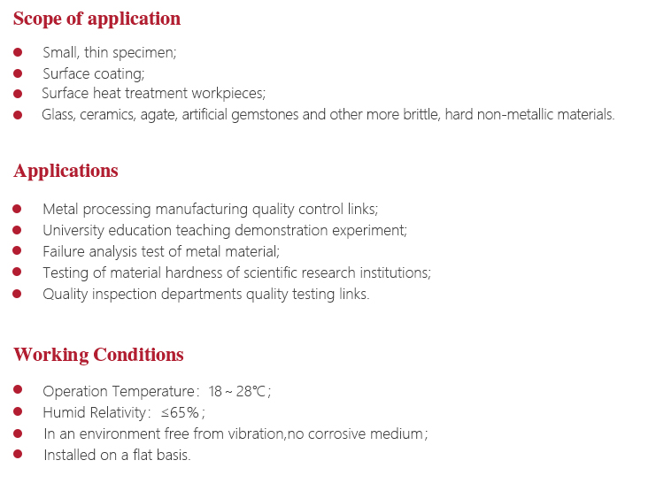 l Meet ISO 6507, ASTM E92, JIS Z2244, GB / T4340.2 and other relevant domestic and foreign standards.