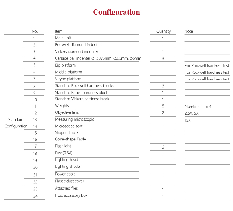 | Vickers testing force | 294N(30kg), 980N(100kg)Tolerance±1.0% |