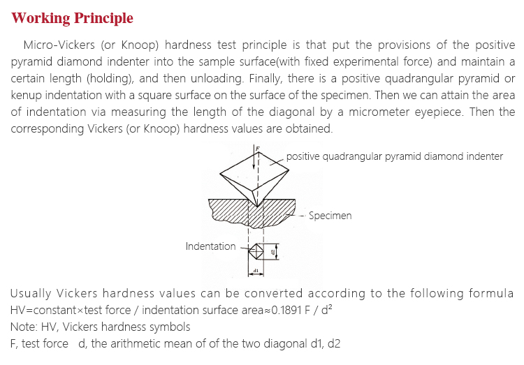 Working PrincipleMicro-Vickers (or Knoop) hardness test principle is that put the provisions of the positive pyramid diamond indenter into the sample surface(with fixed experimental force) and maintain a certain length (holding), and then unloading. Finally, there is a positive quadrangular pyramid or kenup indentation with a square surface on the surface of the specimen. Then we can attain the area of indentation via measuring the length of the diagonal by a micrometer eyepiece. Then the corresponding Vickers (or Knoop) hardness values are obtained.