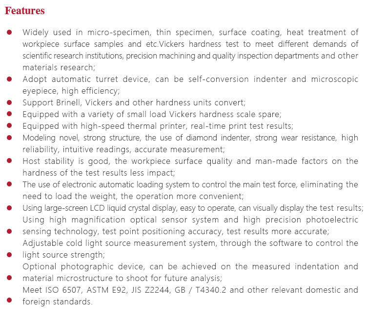 Instrument FeaturesWidely used in micro-specimen, thin specimen, surface coating, heat treatment of workpiece surface samples and etc.Vickers hardness test to meet different demands of scientific research institutions, precision machining and quality inspection departments and other materials research;