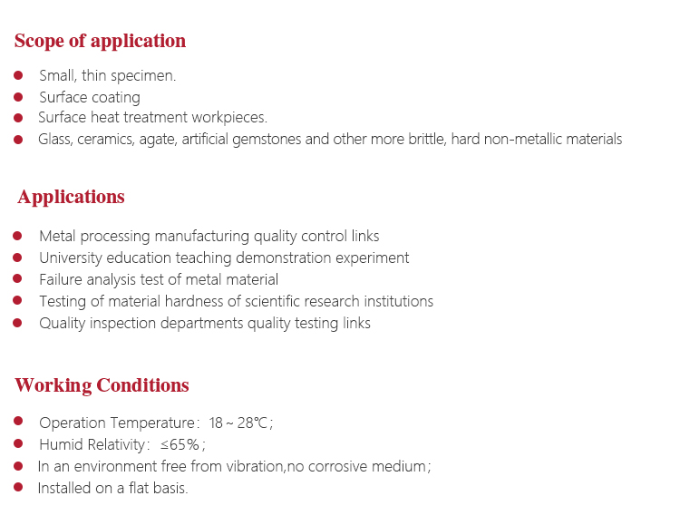 Instrument FeaturesWidely used in micro-specimen, thin specimen, surface coating, heat treatment of workpiece surface samples and etc.Vickers hardness test to meet different demands of scientific research institutions, precision machining and quality inspection departments and other materials research;