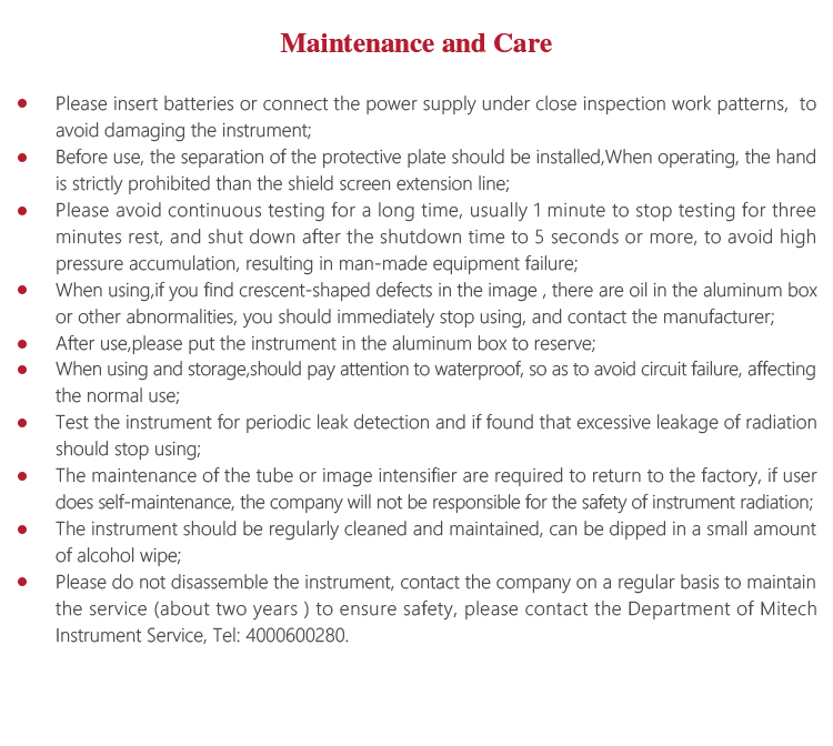 <!--[if !supportLists]-->l <!--[endif]-->The maintenance of the tube or image intensifier are required to return to the factory, if user does self-maintenance, the company will not