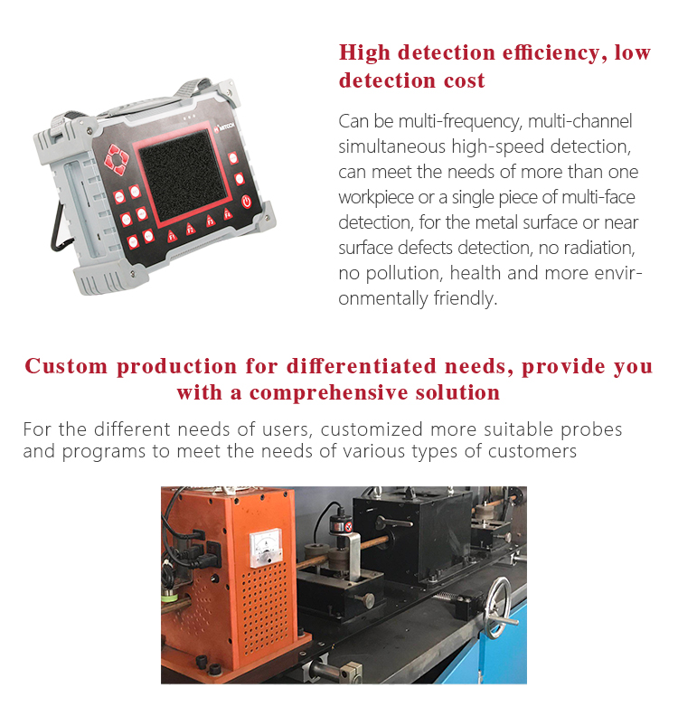 Product OverviewMitech MET Series Portable Eddy Current Flaw Detector,also known as digital electromagnetic detecor,based on the principle of electromagnetic induction,can detect various metal parts surface or near surface defects with high-speed. It uses advanced DSP digital processing and FPGA technology innovation designed, with 5.7-inch TFT LCD screen, can clearly display the detection data.The product has high sensitivity, stable performance, multi-channel simultaneous detection and intelligent data analysis, can be equipped with intelligent probe, can also be customized probe according to customer needs , with extended magnetic memory, coating thickness, conductivity measurement and other practical Features. It is widely used in all kinds of metal pipe rods, auto parts, bearings, oil casing, oil control rods, ring metal parts in non-destructive testing and scientific research and other areas of higher education research.It is the necessary professional precision testing equipment to improve production efficiency, saving production costs.